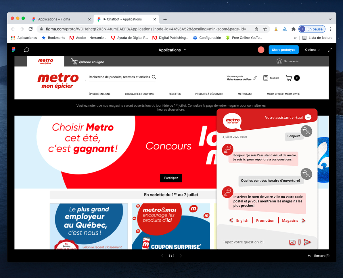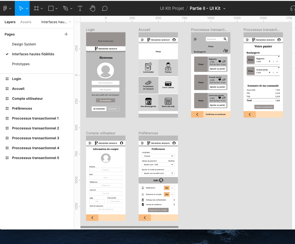 Les sections de compte utilisateur, l’accueil, le processus transactionnel, le login et les préférences sont développés dans les maquettes et le prototypage.