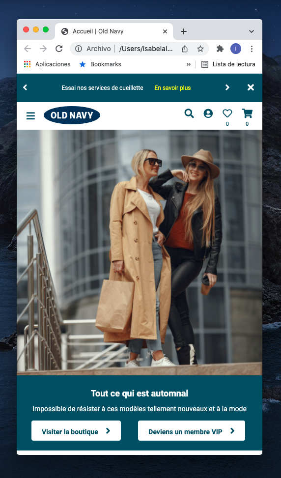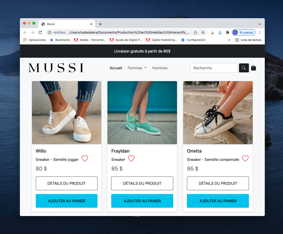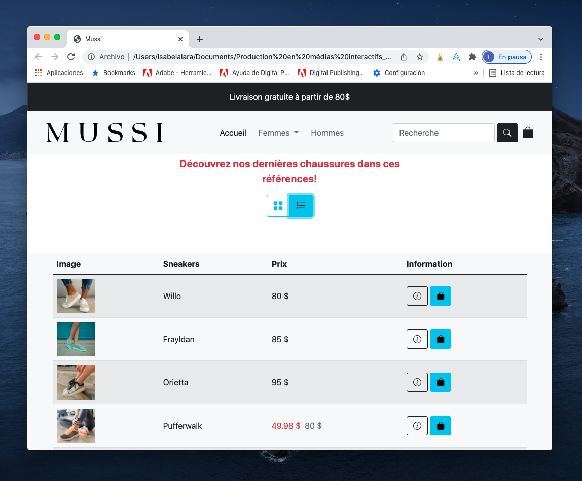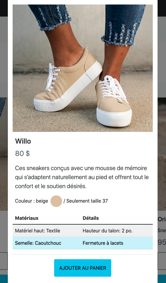 - Les produits sont accompagnés de deux boutons. Le premier bouton montre la suivante information : une photo, un titre, un paragraphe de description et une liste de caractéristiques détaillée d’une référence de soulier dans une fenêtre modale. Le deuxième bouton ajoute le produit au panier d’achats.